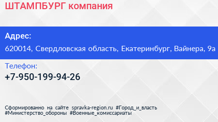 ШТАМПБУРГ, компания по адресу 620014, Свердловская область, Екатеринбург, Вайнера, 9а в дальнейшем Организация, размещена в следующих категориях: