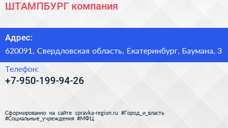 ШТАМПБУРГ, компания по адресу 620091, Свердловская область, Екатеринбург, Баумана, 3 в дальнейшем Организация, размещена в следующих категориях: