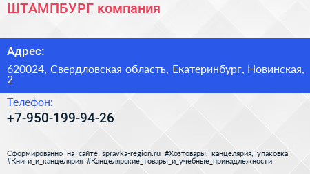 ШТАМПБУРГ, компания по адресу 620024, Свердловская область, Екатеринбург, Новинская, 2 в дальнейшем Организация, размещена в следующих категориях: