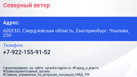 Северный ветер по адресу 620110, Свердловская область, Екатеринбург, Чкалова, 250 в дальнейшем Организация, размещена в следующих категориях: