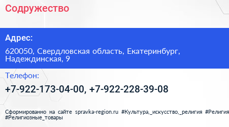 Содружество по адресу 620050, Свердловская область, Екатеринбург, Надеждинская, 9 в дальнейшем Организация, размещена в следующих категориях:
