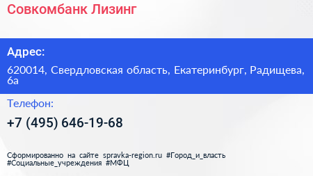 Совкомбанк Лизинг по адресу 620014, Свердловская область, Екатеринбург, Радищева, 6а в дальнейшем Организация, размещена в следующих категориях: