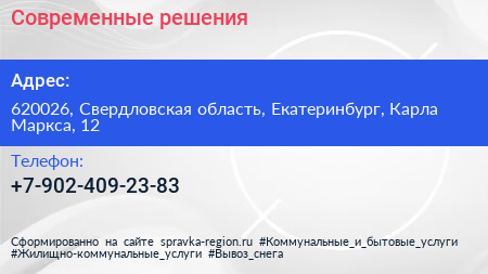 Современные решения по адресу 620026, Свердловская область, Екатеринбург, Карла Маркса, 12 в дальнейшем Организация, размещена в следующих категориях: