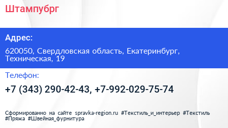 Штампубрг по адресу 620050, Свердловская область, Екатеринбург, Техническая, 19 в дальнейшем Организация, размещена в следующих категориях: