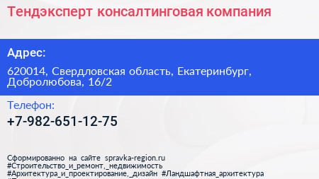 Тендэксперт, консалтинговая компания по адресу 620014, Свердловская область, Екатеринбург, Добролюбова, 16/2 в дальнейшем Организация, размещена в следующих категориях: