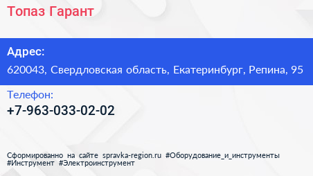 Топаз Гарант по адресу 620043, Свердловская область, Екатеринбург, Репина, 95 в дальнейшем Организация, размещена в следующих категориях: