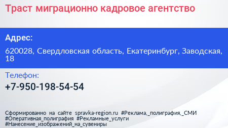 Траст, миграционно-кадровое агентство по адресу 620028, Свердловская область, Екатеринбург, Заводская, 18 в дальнейшем Организация, размещена в следующих категориях:
