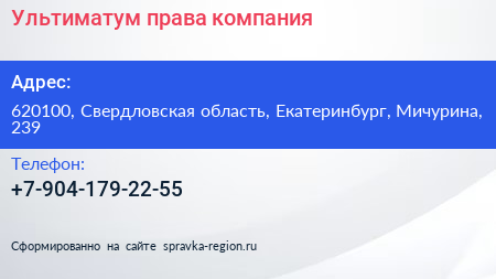 Ультиматум права, компания по адресу 620100, Свердловская область, Екатеринбург, Мичурина, 239 в дальнейшем Организация, размещена в следующих категориях: