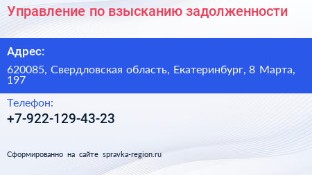 Управление по взысканию задолженности по адресу 620085, Свердловская область, Екатеринбург, 8 Марта, 197 в дальнейшем Организация, размещена в следующих категориях: