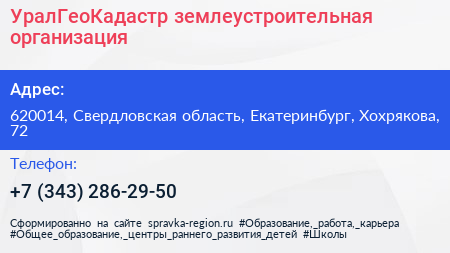 УралГеоКадастр, землеустроительная организация по адресу 620014, Свердловская область, Екатеринбург, Хохрякова, 72 в дальнейшем Организация, размещена в следующих категориях: