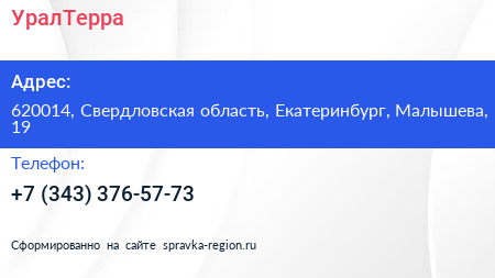 УралТерра по адресу 620014, Свердловская область, Екатеринбург, Малышева, 19 в дальнейшем Организация, размещена в следующих категориях: