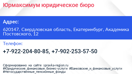 Юрмаксимум, юридическое бюро по адресу 620147, Свердловская область, Екатеринбург, Академика Постовского, 12 в дальнейшем Организация, размещена в следующих категориях: