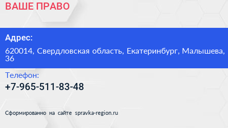ВАШЕ ПРАВО по адресу 620014, Свердловская область, Екатеринбург, Малышева, 36 в дальнейшем Организация, размещена в следующих категориях: