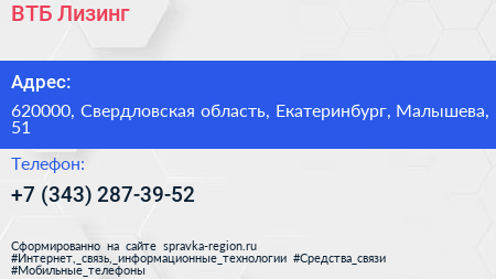 ВТБ Лизинг по адресу 620000, Свердловская область, Екатеринбург, Малышева, 51 в дальнейшем Организация, размещена в следующих категориях: