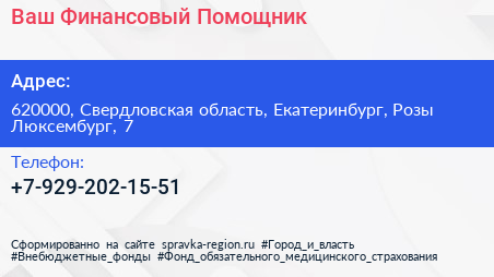 Ваш Финансовый Помощник по адресу 620000, Свердловская область, Екатеринбург, Розы Люксембург, 7 в дальнейшем Организация, размещена в следующих категориях: