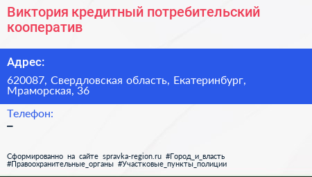 Виктория, кредитный потребительский кооператив по адресу 620087, Свердловская область, Екатеринбург, Мраморская, 36 в дальнейшем Организация, размещена в следующих категориях: