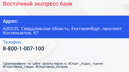 Восточный экспресс банк по адресу 620135, Свердловская область, Екатеринбург, проспект Космонавтов, 47 в дальнейшем Организация, размещена в следующих категориях: