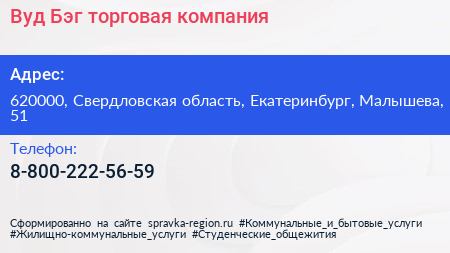 Вуд Бэг, торговая компания по адресу 620000, Свердловская область, Екатеринбург, Малышева, 51 в дальнейшем Организация, размещена в следующих категориях: