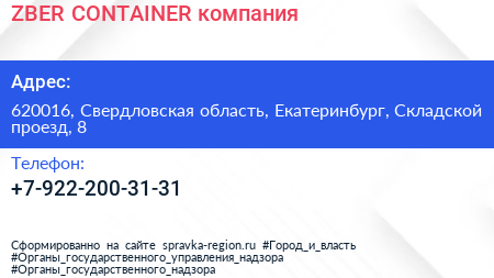 ZBER-CONTAINER, компания по адресу 620016, Свердловская область, Екатеринбург, Складской проезд, 8 в дальнейшем Организация, размещена в следующих категориях: