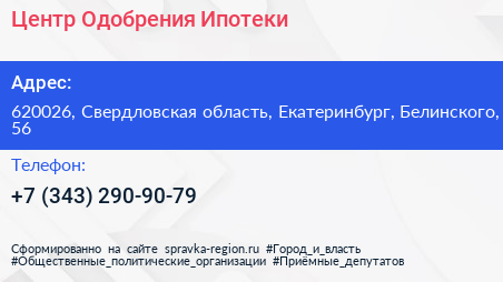 Центр Одобрения Ипотеки по адресу 620026, Свердловская область, Екатеринбург, Белинского, 56 в дальнейшем Организация, размещена в следующих категориях: