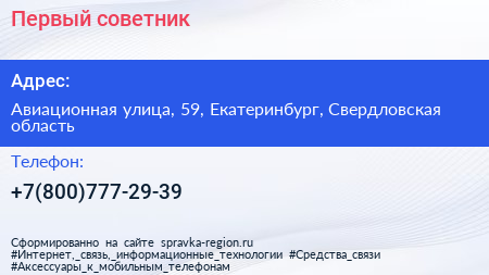 Первый советник по адресу Авиационная улица, 59, Екатеринбург, Свердловская область в дальнейшем Организация, размещена в следующих категориях: