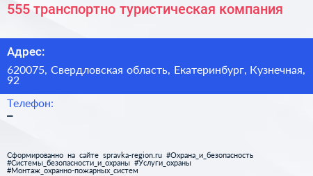 555, транспортно-туристическая компания по адресу 620075, Свердловская область, Екатеринбург, Кузнечная, 92 в дальнейшем Организация, размещена в следующих категориях: