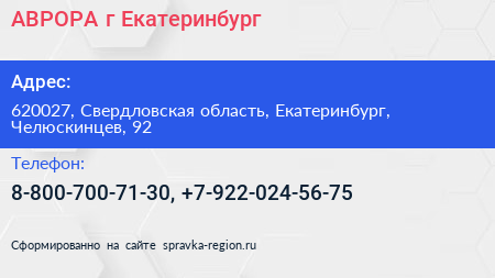 АВРОРА, г. Екатеринбург по адресу 620027, Свердловская область, Екатеринбург, Челюскинцев, 92 в дальнейшем Организация, размещена в следующих категориях: