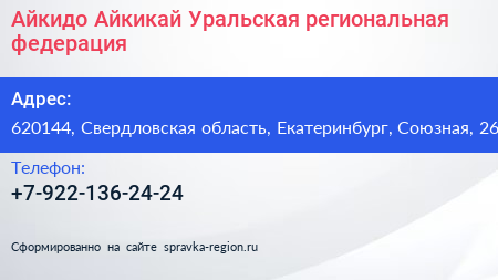 Айкидо Айкикай, Уральская региональная федерация по адресу 620144, Свердловская область, Екатеринбург, Союзная, 26 в дальнейшем Организация, размещена в следующих категориях: