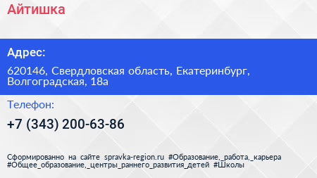 Айтишка по адресу 620146, Свердловская область, Екатеринбург, Волгоградская, 18а в дальнейшем Организация, размещена в следующих категориях: