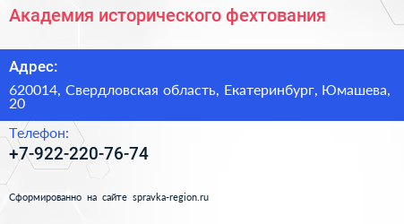 Академия исторического фехтования по адресу 620014, Свердловская область, Екатеринбург, Юмашева, 20 в дальнейшем Организация, размещена в следующих категориях: