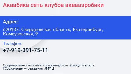 Аквабика, сеть клубов аквааэробики по адресу 620137, Свердловская область, Екатеринбург, Комвузовская, 9 в дальнейшем Организация, размещена в следующих категориях: