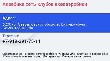 Аквабика, сеть клубов аквааэробики по адресу 620078, Свердловская область, Екатеринбург, Коминтерна, 14а в дальнейшем Организация, размещена в следующих категориях: