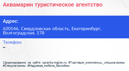 Аквамарин, туристическое агентство по адресу 620146, Свердловская область, Екатеринбург, Волгоградская, 178 в дальнейшем Организация, размещена в следующих категориях: