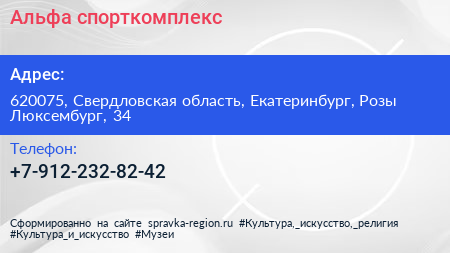 Альфа, спорткомплекс по адресу 620075, Свердловская область, Екатеринбург, Розы Люксембург, 34 в дальнейшем Организация, размещена в следующих категориях: