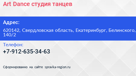 Art Dance, студия танцев по адресу 620142, Свердловская область, Екатеринбург, Белинского, 140/2 в дальнейшем Организация, размещена в следующих категориях: