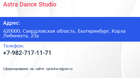 Astra Dance Studio по адресу 620000, Свердловская область, Екатеринбург, Карла Либкнехта, 23а в дальнейшем Организация, размещена в следующих категориях: