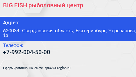 BIG FISH, рыболовный центр по адресу 620034, Свердловская область, Екатеринбург, Черепанова, 1а в дальнейшем Организация, размещена в следующих категориях: