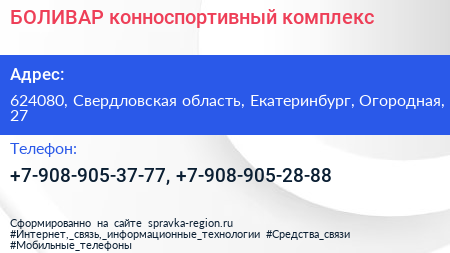 БОЛИВАР, конноспортивный комплекс по адресу 624080, Свердловская область, Екатеринбург, Огородная, 27 в дальнейшем Организация, размещена в следующих категориях: