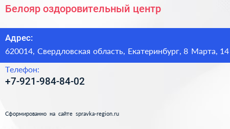 Белояр, оздоровительный центр по адресу 620014, Свердловская область, Екатеринбург, 8 Марта, 14 в дальнейшем Организация, размещена в следующих категориях: