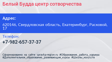 Белый Будда, центр сотворчества по адресу 620146, Свердловская область, Екатеринбург, Расковой, 17 в дальнейшем Организация, размещена в следующих категориях:
