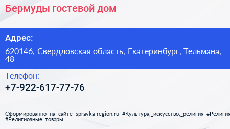 Бермуды, гостевой дом по адресу 620146, Свердловская область, Екатеринбург, Тельмана, 48 в дальнейшем Организация, размещена в следующих категориях: