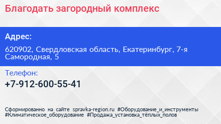Благодать, загородный комплекс по адресу 620902, Свердловская область, Екатеринбург, 7-я Самородная, 5 в дальнейшем Организация, размещена в следующих категориях: