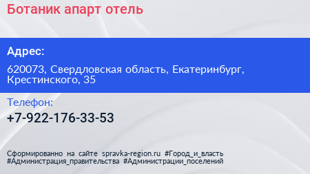 Ботаник, апарт-отель по адресу 620073, Свердловская область, Екатеринбург, Крестинского, 35 в дальнейшем Организация, размещена в следующих категориях: