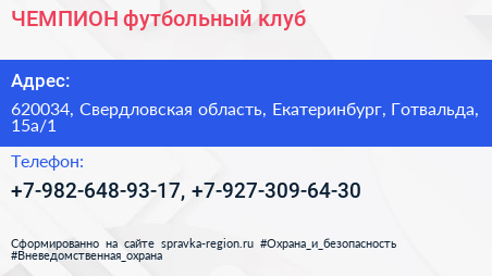 ЧЕМПИОН, футбольный клуб по адресу 620034, Свердловская область, Екатеринбург, Готвальда, 15а/1 в дальнейшем Организация, размещена в следующих категориях:
