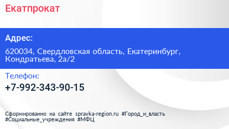 Екатпрокат по адресу 620034, Свердловская область, Екатеринбург, Кондратьева, 2а/2 в дальнейшем Организация, размещена в следующих категориях:
