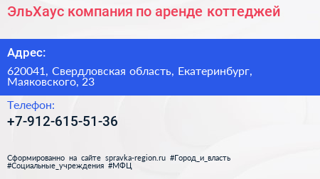 ЭльХаус, компания по аренде коттеджей по адресу 620041, Свердловская область, Екатеринбург, Маяковского, 23 в дальнейшем Организация, размещена в следующих категориях: