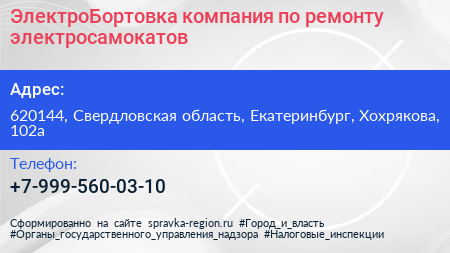ЭлектроБортовка, компания по ремонту электросамокатов по адресу 620144, Свердловская область, Екатеринбург, Хохрякова, 102а в дальнейшем Организация, размещена в следующих категориях: