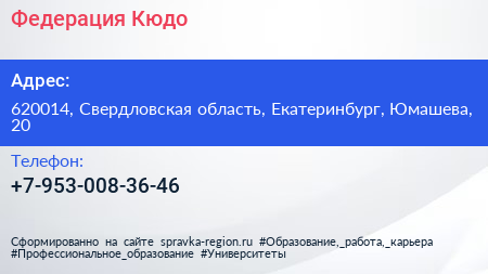 Федерация Кюдо по адресу 620014, Свердловская область, Екатеринбург, Юмашева, 20 в дальнейшем Организация, размещена в следующих категориях: