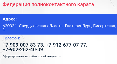 Федерация полноконтактного каратэ по адресу 620024, Свердловская область, Екатеринбург, Бисертская, 1 в дальнейшем Организация, размещена в следующих категориях:
