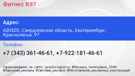 Фитнес K97 по адресу 620105, Свердловская область, Екатеринбург, Краснолесья, 97 в дальнейшем Организация, размещена в следующих категориях: